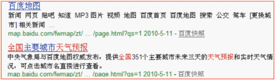例子中的網(wǎng)頁,提供全國(guó)主要城市的天氣預(yù)報(bào)服務(wù),第一個(gè)結(jié)果中,使用了百度地圖默認(rèn)的t i t l e ,用戶在搜索結(jié)果無法判斷這個(gè)網(wǎng)站提供的內(nèi)容是什么,也就不會(huì)點(diǎn)擊這個(gè)結(jié)果,第二個(gè)結(jié)果中,t i t l e 很明確的寫明了所提供的內(nèi)容,用戶判斷起來比較容易,選擇這個(gè)結(jié)果的可能性比較大。