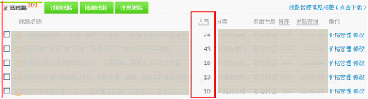 2.網(wǎng)店操作后臺(點(diǎn)擊下面的截圖中的“人氣”兩字,可以使線路按照人氣值從高到低或者是從低到高進(jìn)行排序):