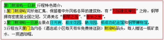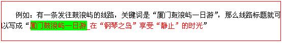 線路關(guān)鍵詞一定要出現(xiàn)在線路特色中——關(guān)鍵詞是以多種組合形式出現(xiàn)的(原詞完整出現(xiàn)、同義詞分散出現(xiàn))——原詞也盡量出現(xiàn)在線路特色的最前面。(切忌堆砌關(guān)鍵詞)