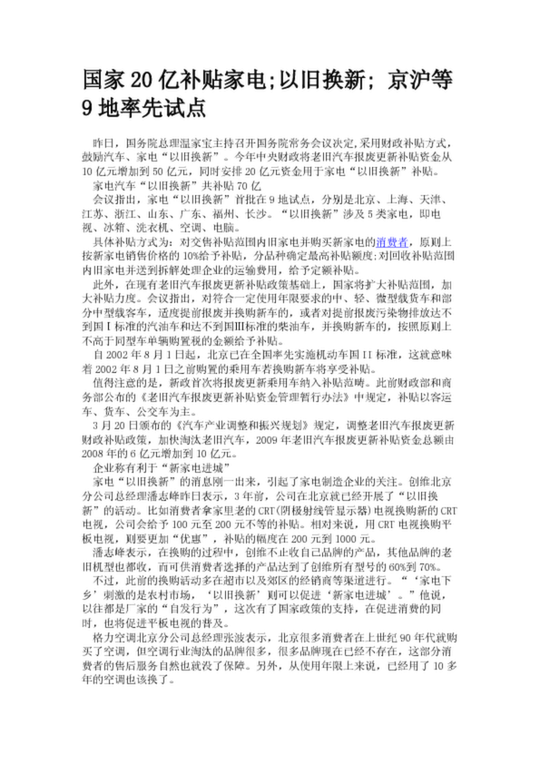 國家20億補貼家電"以舊換新" 京滬等9地率先試點(24.32KB)
