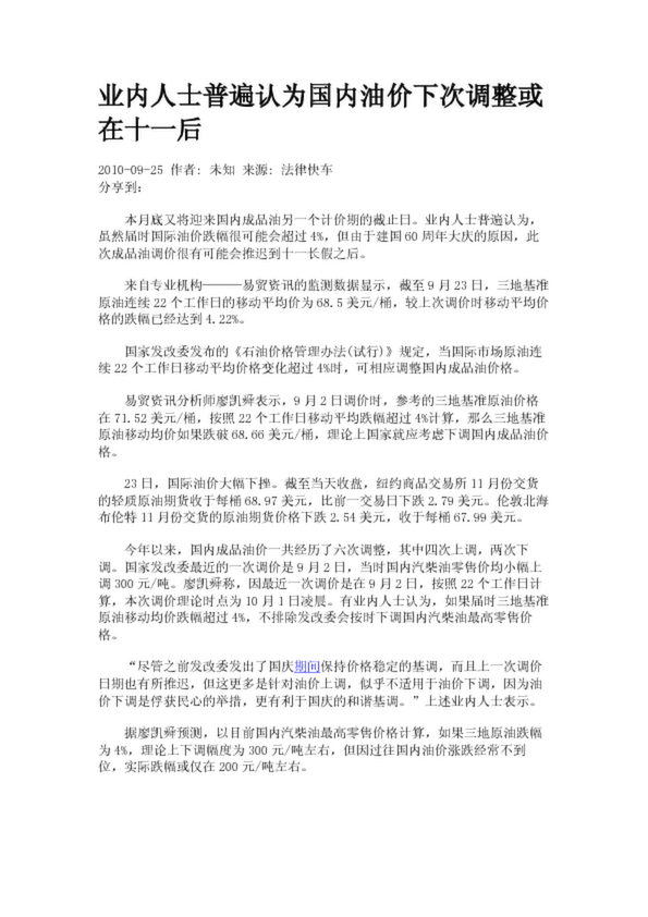業(yè)內(nèi)人士普遍認(rèn)為國內(nèi)油價下次調(diào)整或在十一后
