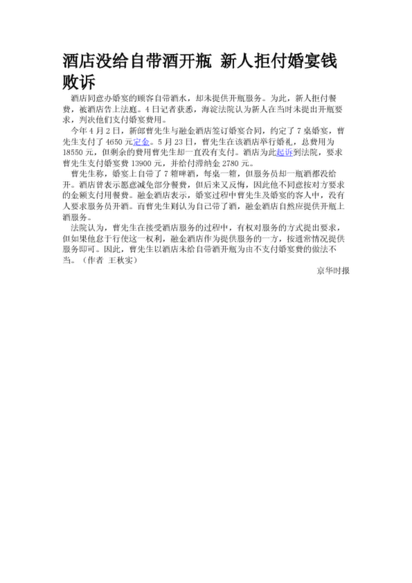 酒店沒給自帶酒開瓶 新人拒付婚宴錢敗訴(17.58KB)