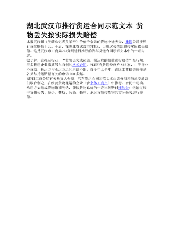 湖北武漢市推行貨運合同示范文本 貨物丟失按實際損失賠償