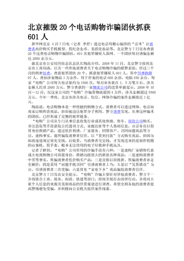北京摧毀20個電話購物詐騙團伙抓獲601人(20.00KB)
