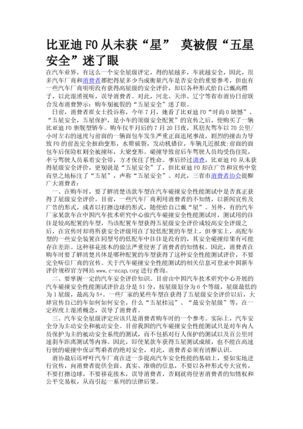 比亞迪F0從未獲“星” 莫被假“五星安全”迷了眼