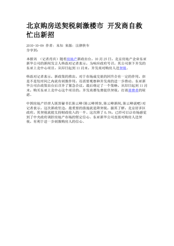 北京購房送契稅刺激樓市 開發商自救忙出新招(2.67KB)