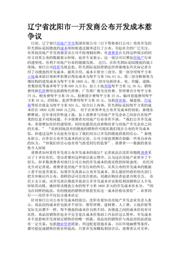 遼寧省沈陽(yáng)市一開(kāi)發(fā)商公布開(kāi)發(fā)成本惹爭(zhēng)議