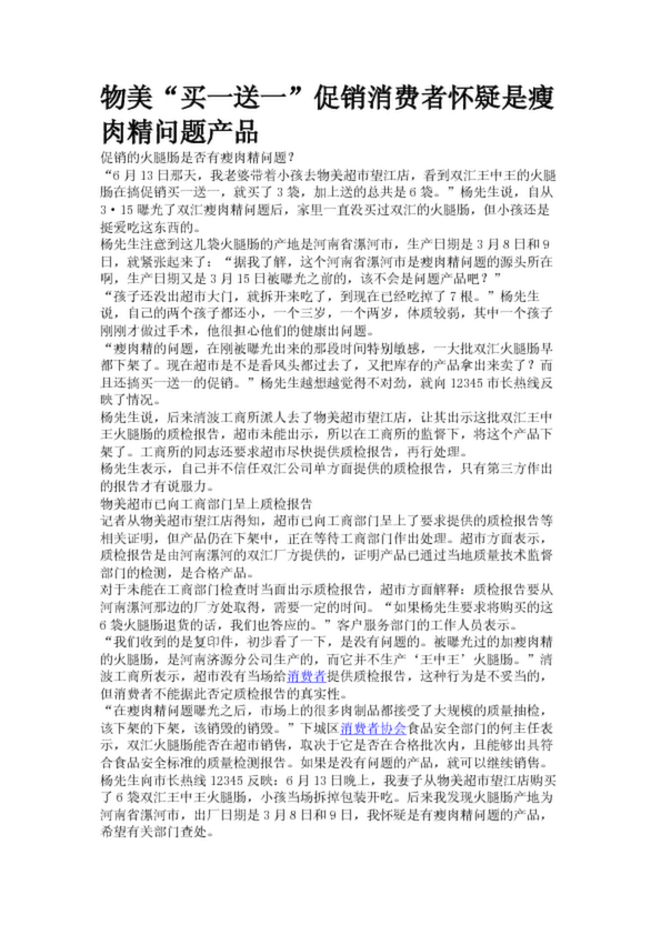 物美“買一送一”促銷消費者懷疑是瘦肉精問題產品