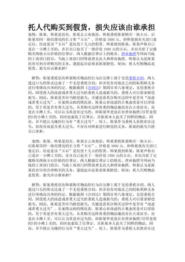 托人代購買到假貨,損失應該由誰承擔