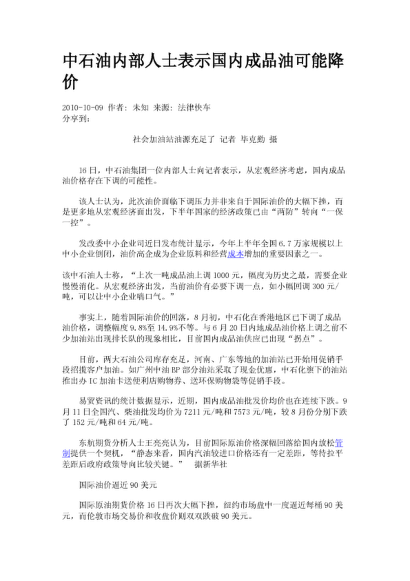 中石油內部人士表示國內成品油可能降價(7.23KB)