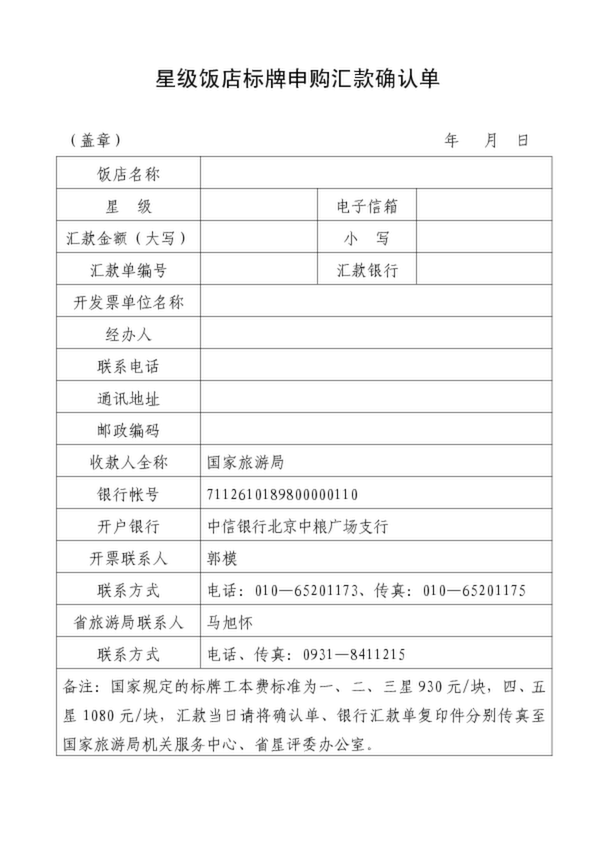 星級飯店標(biāo)牌申購匯款確認(rèn)單