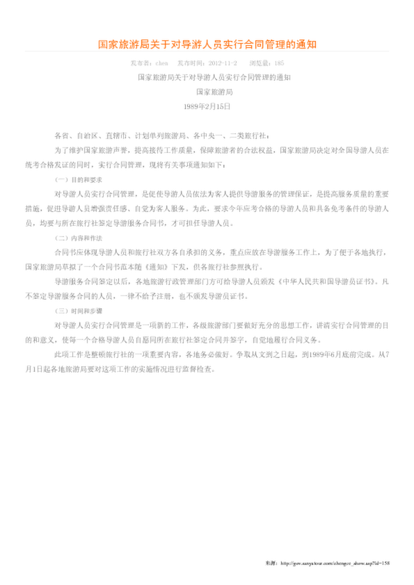 國(guó)家旅游局關(guān)于對(duì)導(dǎo)游人員實(shí)行合同管理的通知