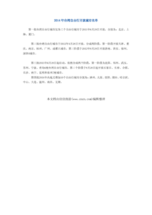 2014年臺灣自由行開放城市名單,2014年宣布的新開放城市名單為:大連、哈爾濱、太原、南昌、貴陽、無錫、煙臺、...
