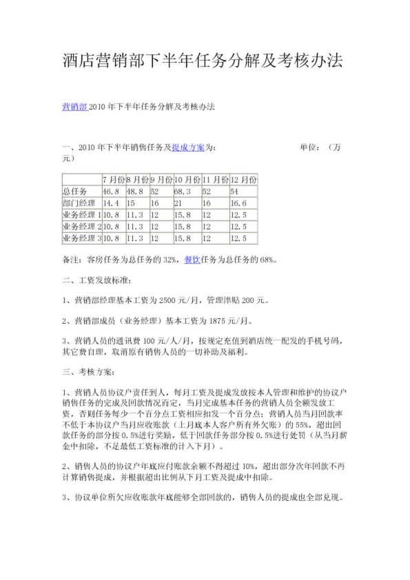 酒店營銷部下半年任務分解及考核辦法(5.02KB)