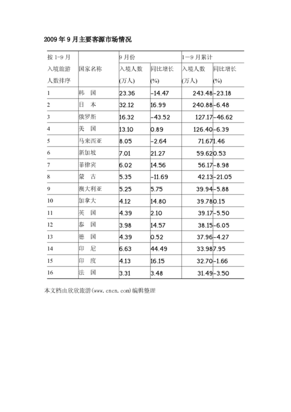 2009年9月主要客源市場情況
