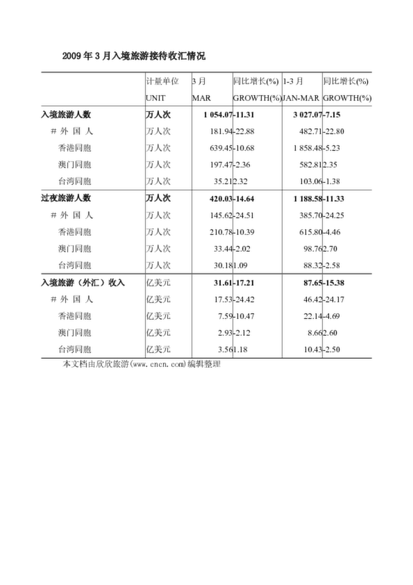 2009年3月入境旅游接待收匯情況