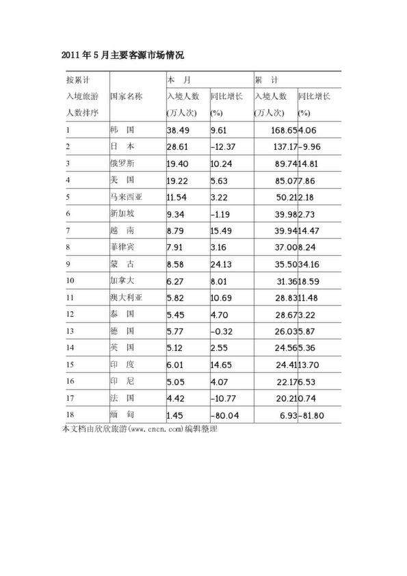 2011年5月主要客源市場情況