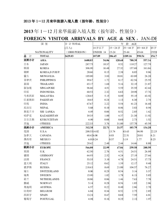 2013年1-12月來華旅游入境人數(按年齡、性別分)