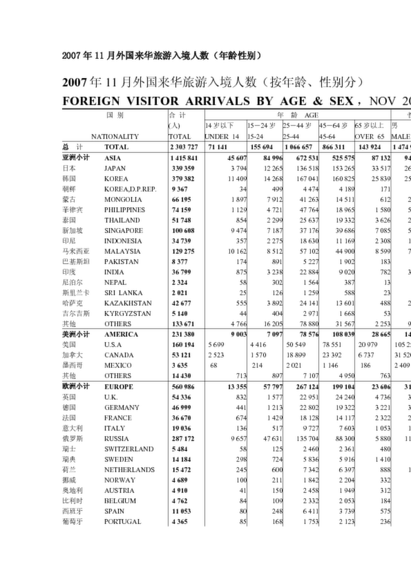 2007年11月外國來華旅游入境人數(年齡性別)