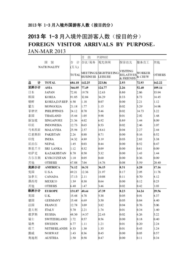 2013年 1-3月入境外國(guó)游客人數(shù)(按目的分)