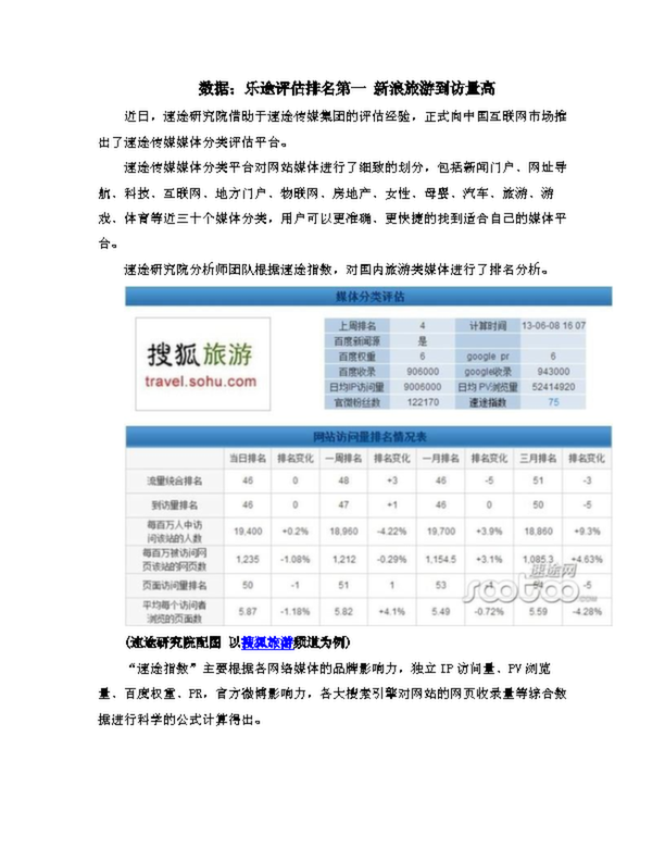 數據:樂途評估排名第一 新浪旅游到訪量高