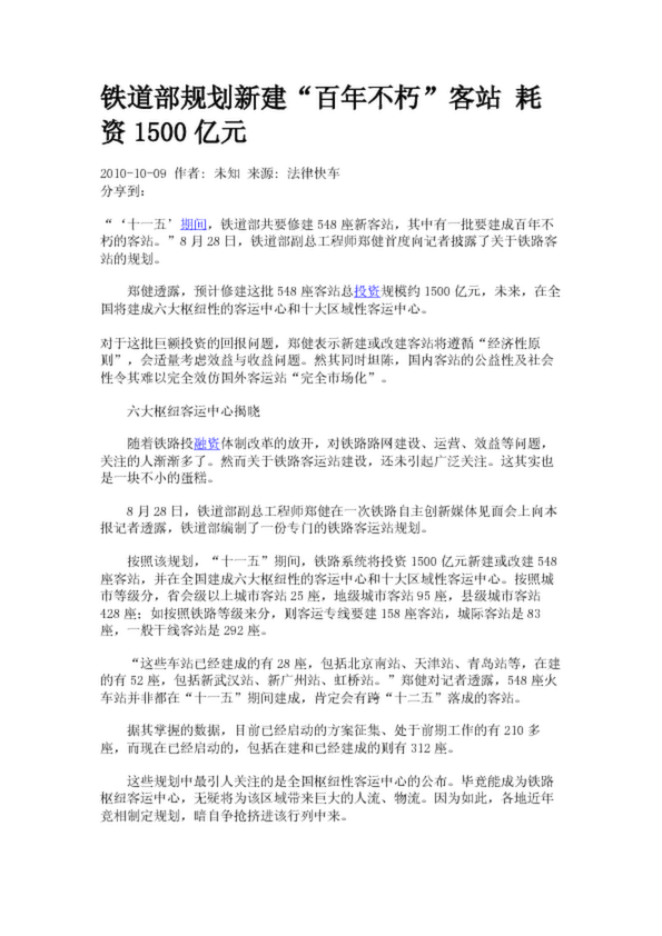 鐵道部規劃新建“百年不朽”客站 耗資1500億元