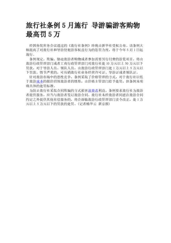 旅行社條例5月施行 導游騙游客購物最高罰5萬(17.52KB)