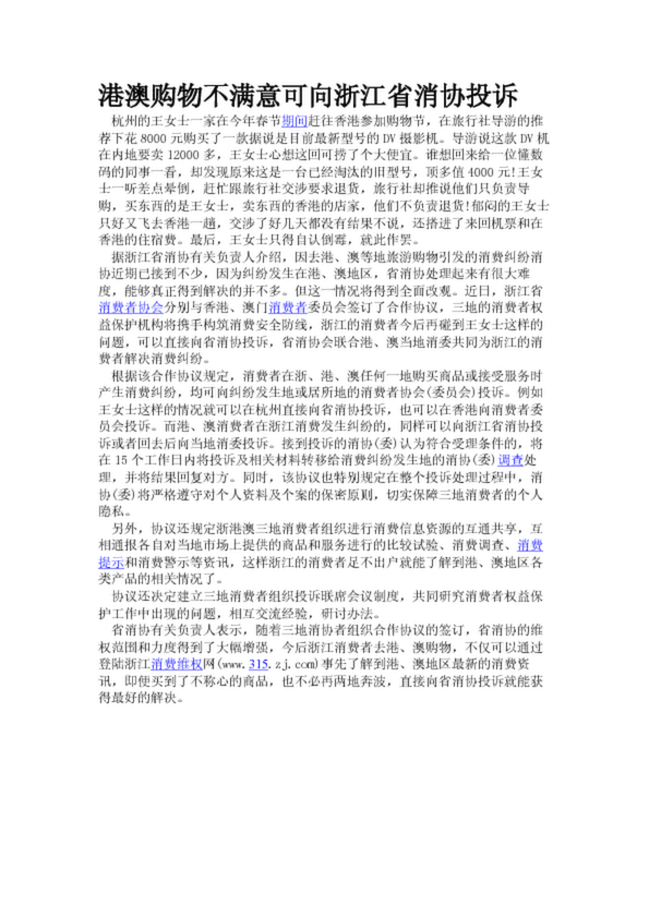 港澳購物不滿意可向浙江省消協投訴(20.40KB)