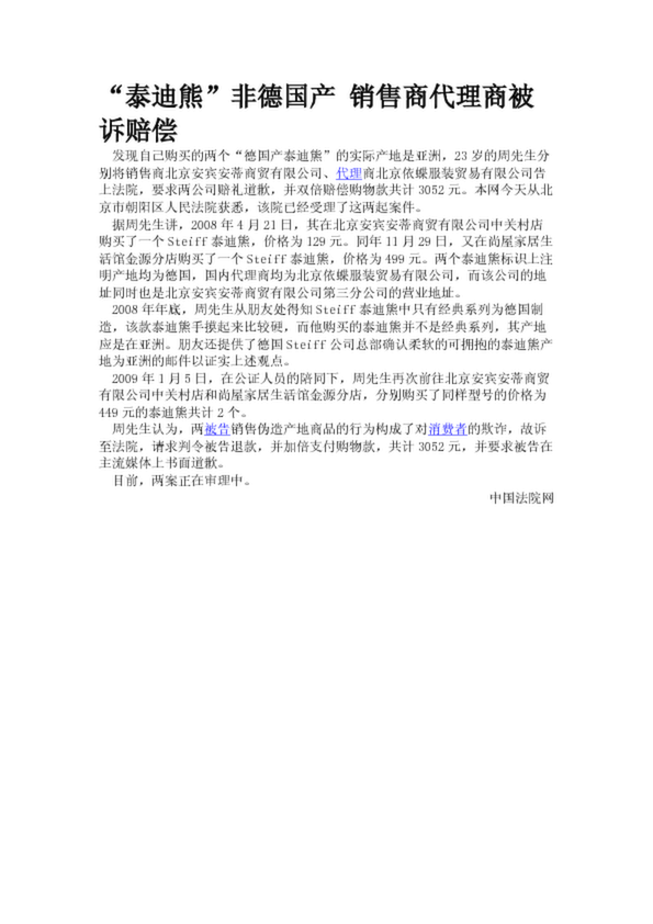 “泰迪熊”非德國產 銷售商代理商被訴賠償